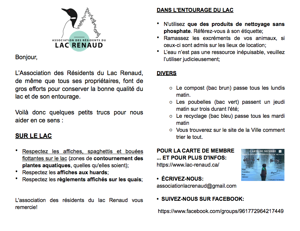 Faites votre chèque à l’ordre de l’association des résidents du lac Renaud et envoyez-le par la poste à l’adresse suivante: 1848 chemin David, Prévost, J0R 1T0.