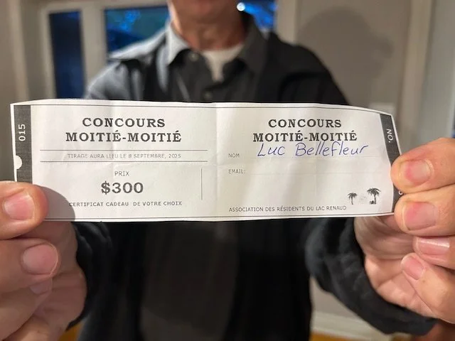 Prenez note que M. Bellefleur a décidé de remettre la totalité de son prix ($300) à l'association des résidents du lac Renaud afin de prendre soin du lac.